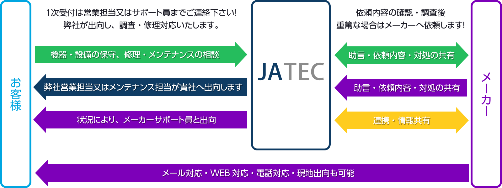 1次受付は弊社で対応します。重篤な修理となる場合はメーカーに依頼します。